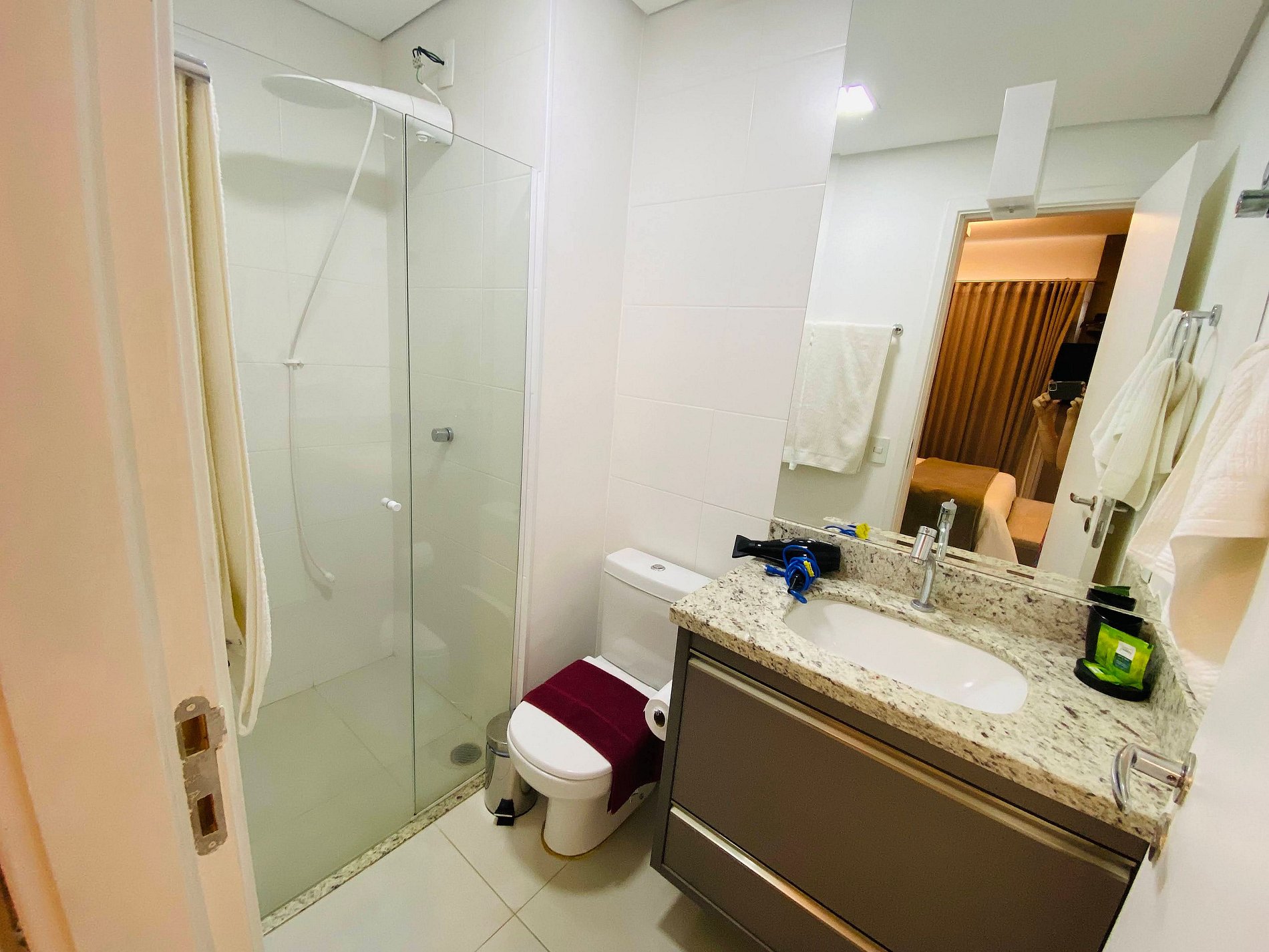 O banheiro tem um chuveiro quente e um enxoval de banho completo, e ainda vem com um secador de cabelo para você ficar ainda mais lindo(a)!