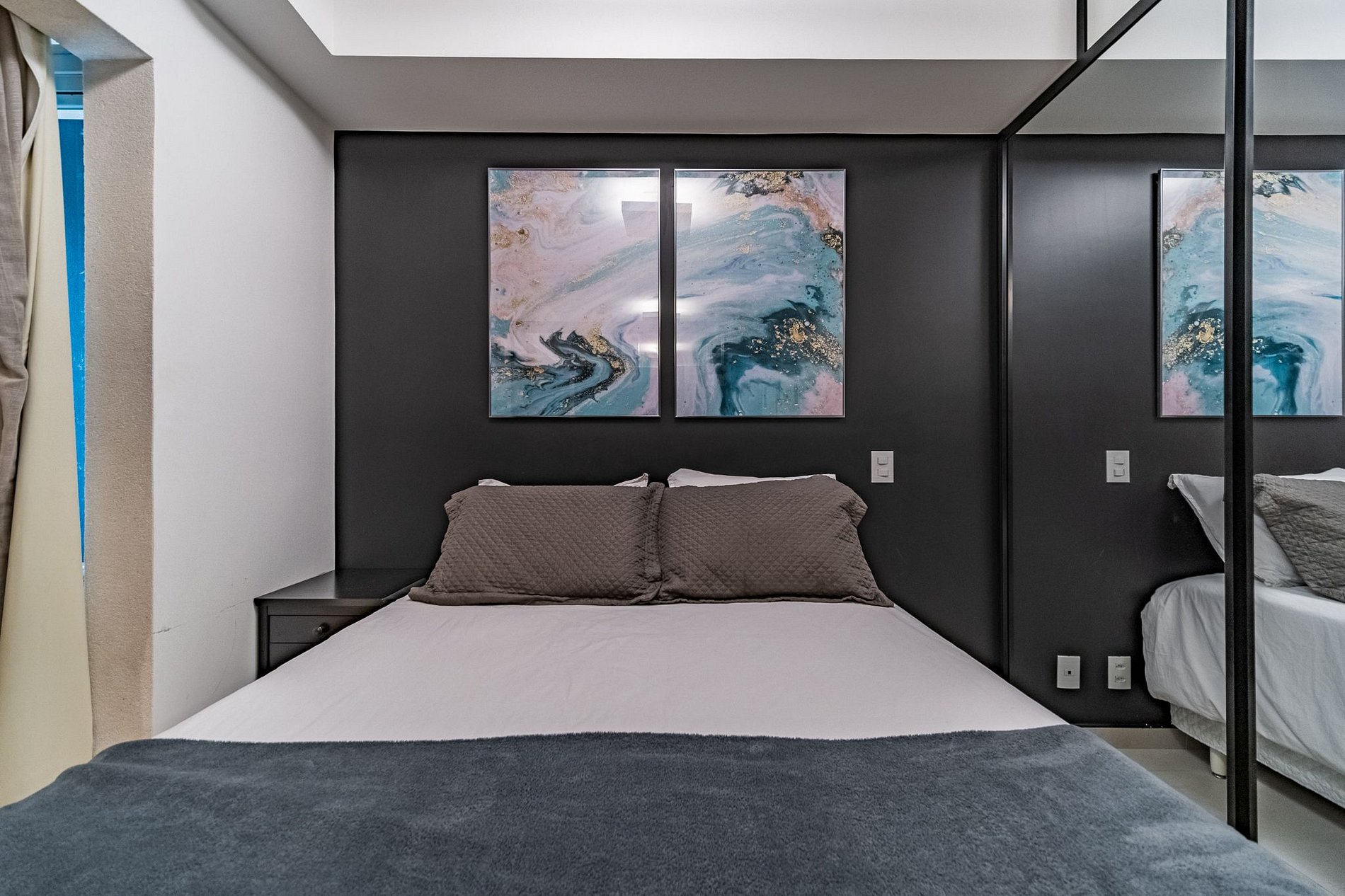 O loft fica no 8o andar e é moderno, com espelho amplo, com black concept, sacada fechada em vidro e cortinas blackout!