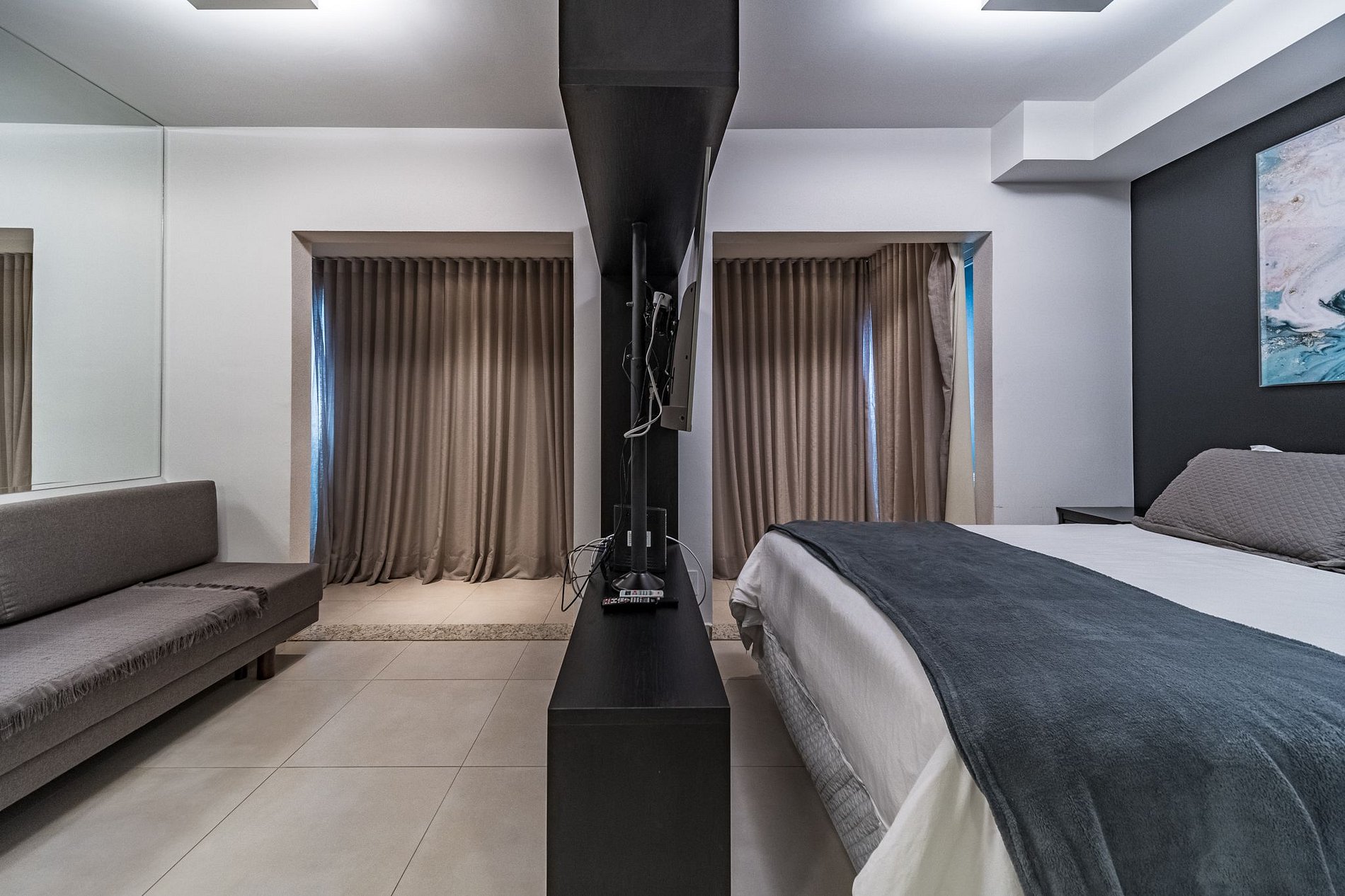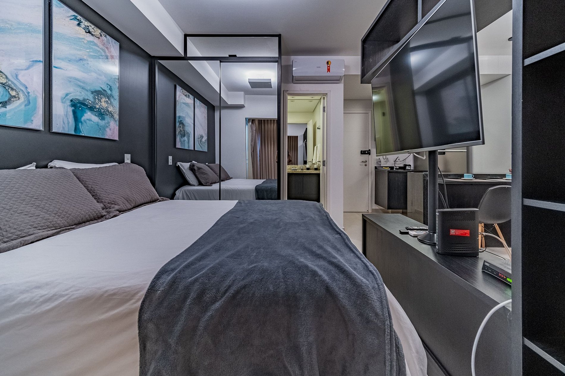 Sala com sofá-cama super espaçoso! Armário black vazado com Smart TV e canais a cabo.