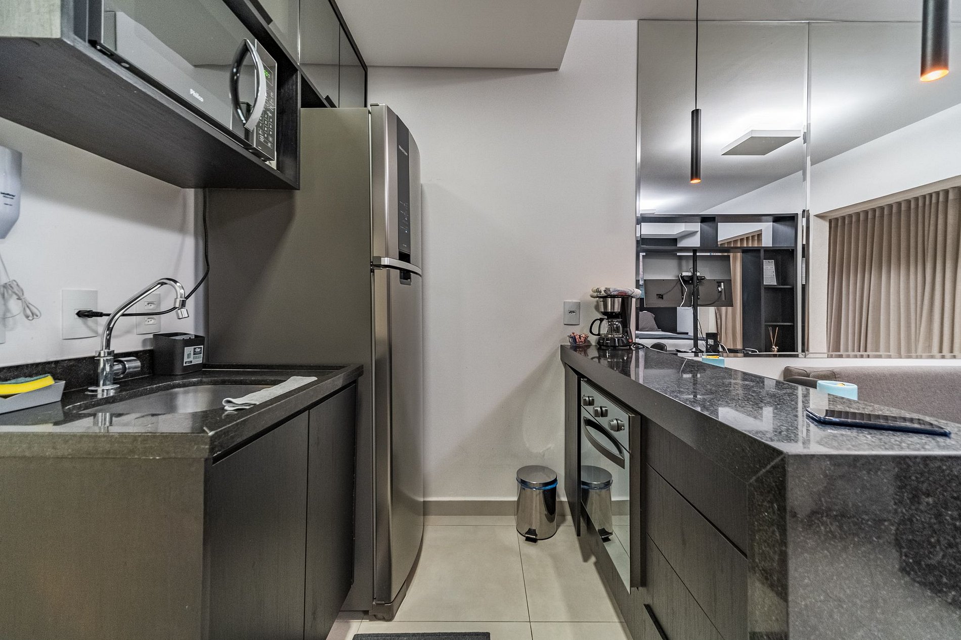 Cozinha com geladeira inox duplex, micro-ondas, fogão indução 1 boca, forno elétrico, cafeteria elétrica e sanduicheira compõem o espaço para torná-lo o mais prático e funcional possível. Além de pratos, talheres, facas, tabua, panelas, assadeiras, copos e taças!