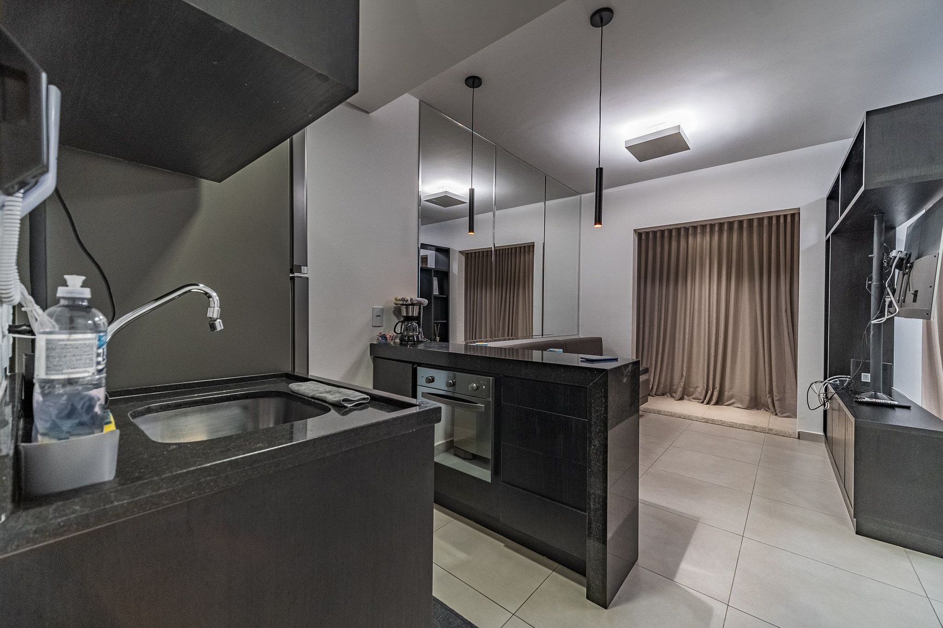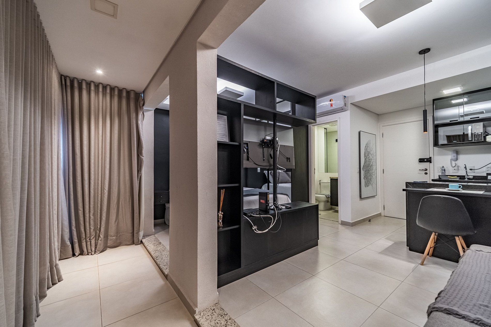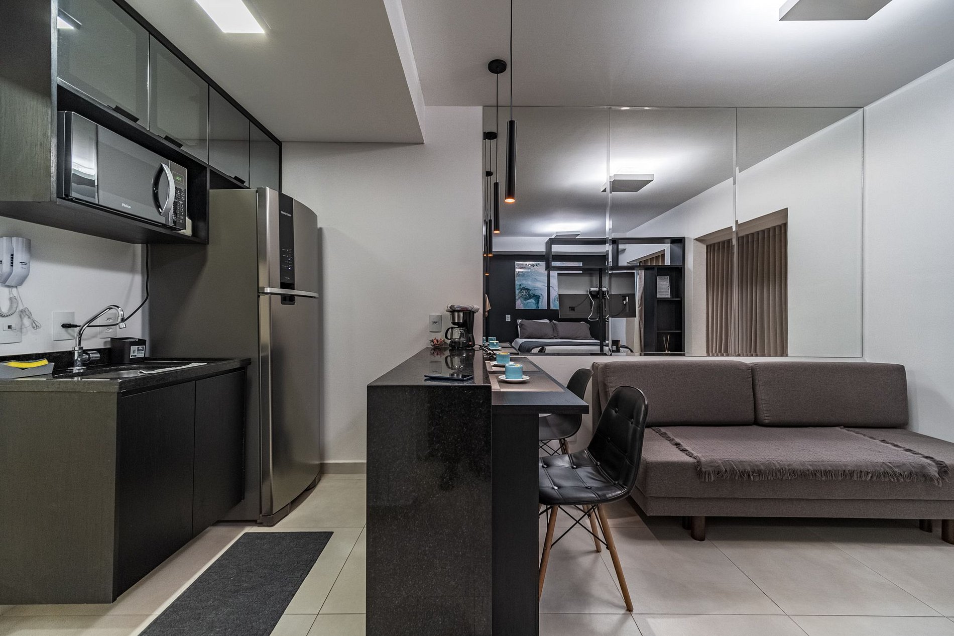 Apartamento com decoração moderna, black concep! Com 33m2, possui quarto/sala/cozinha integrados e banheiro privativo. Possui varanda ampla fechada em vidro para manter o ambiente aconchegante e cortina blackout para sua maior privacidade. Acomoda 2 pessoas confortavelmente em cama casal queen size com roupa de cama e banho completo. Cozinha equipada para o preparo de refeições, com espaço para refeição e trabalho. Smart TV que pode ser vista do quarto e sala. Sofá-cama espaçoso.