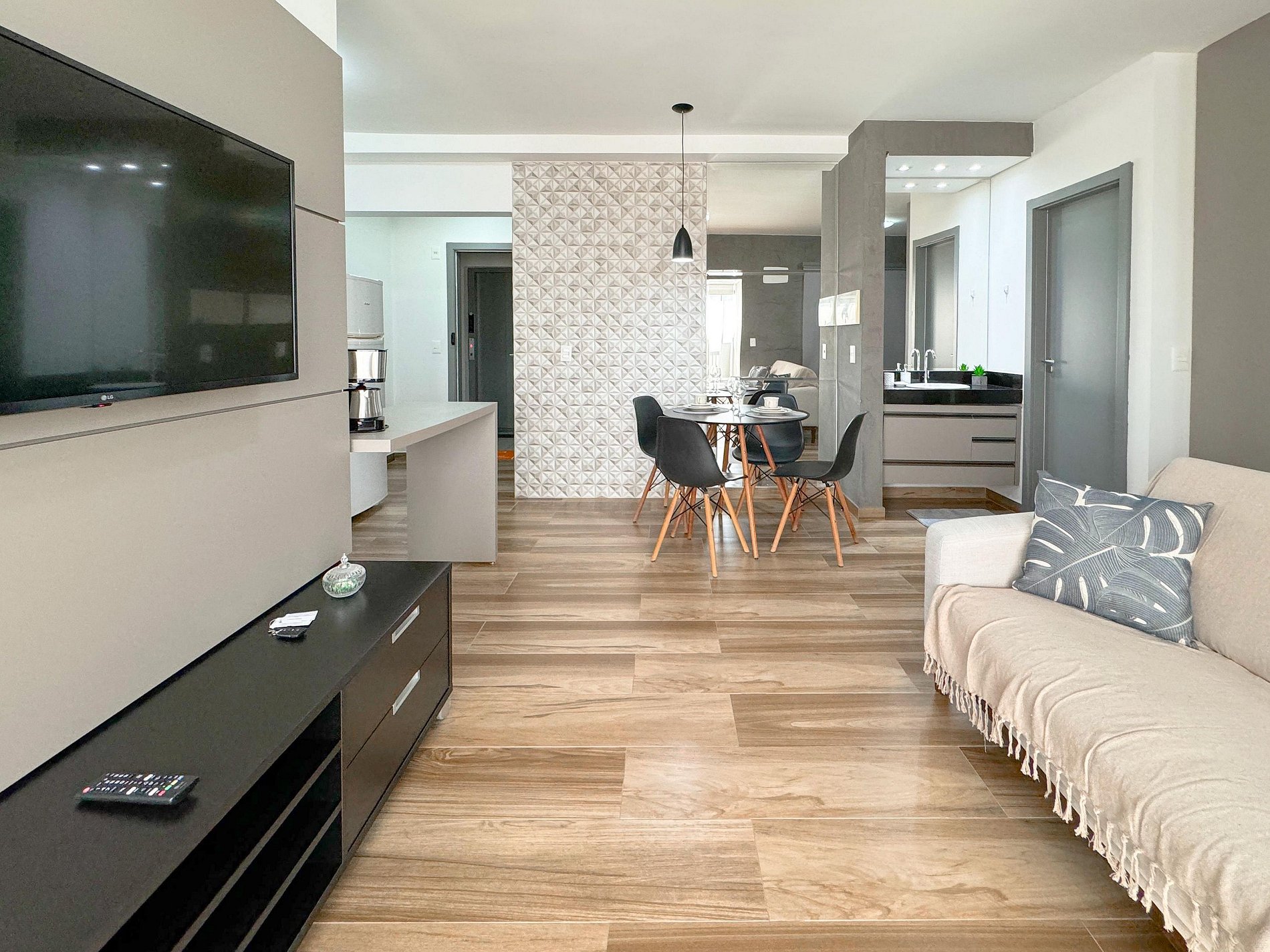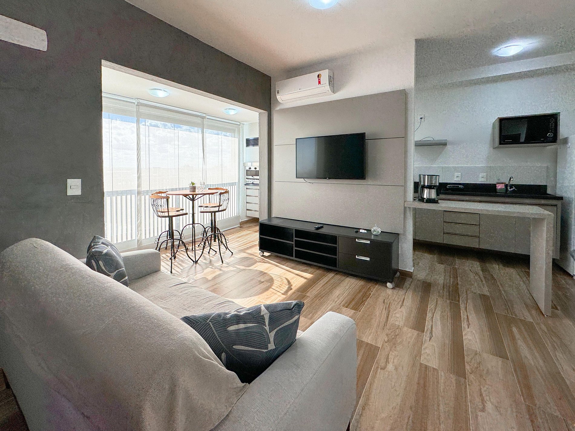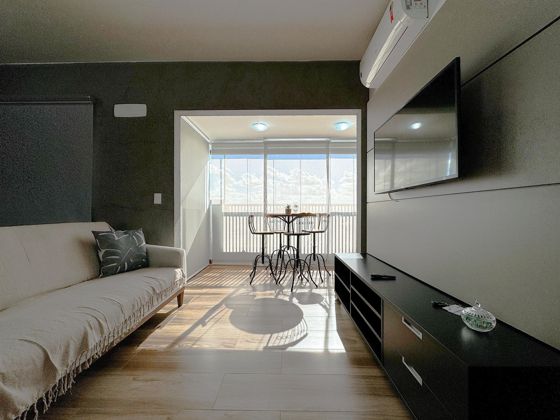 Sala com sofá confortável, smart TV e ar condicionado.