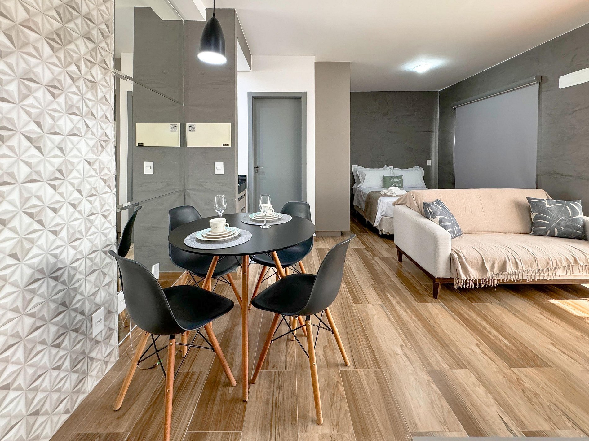 O apto é todo integrado com pintura em cimento queimado, com toques suaves que inspiram um ambiente calmo. Fica no 15o andar.