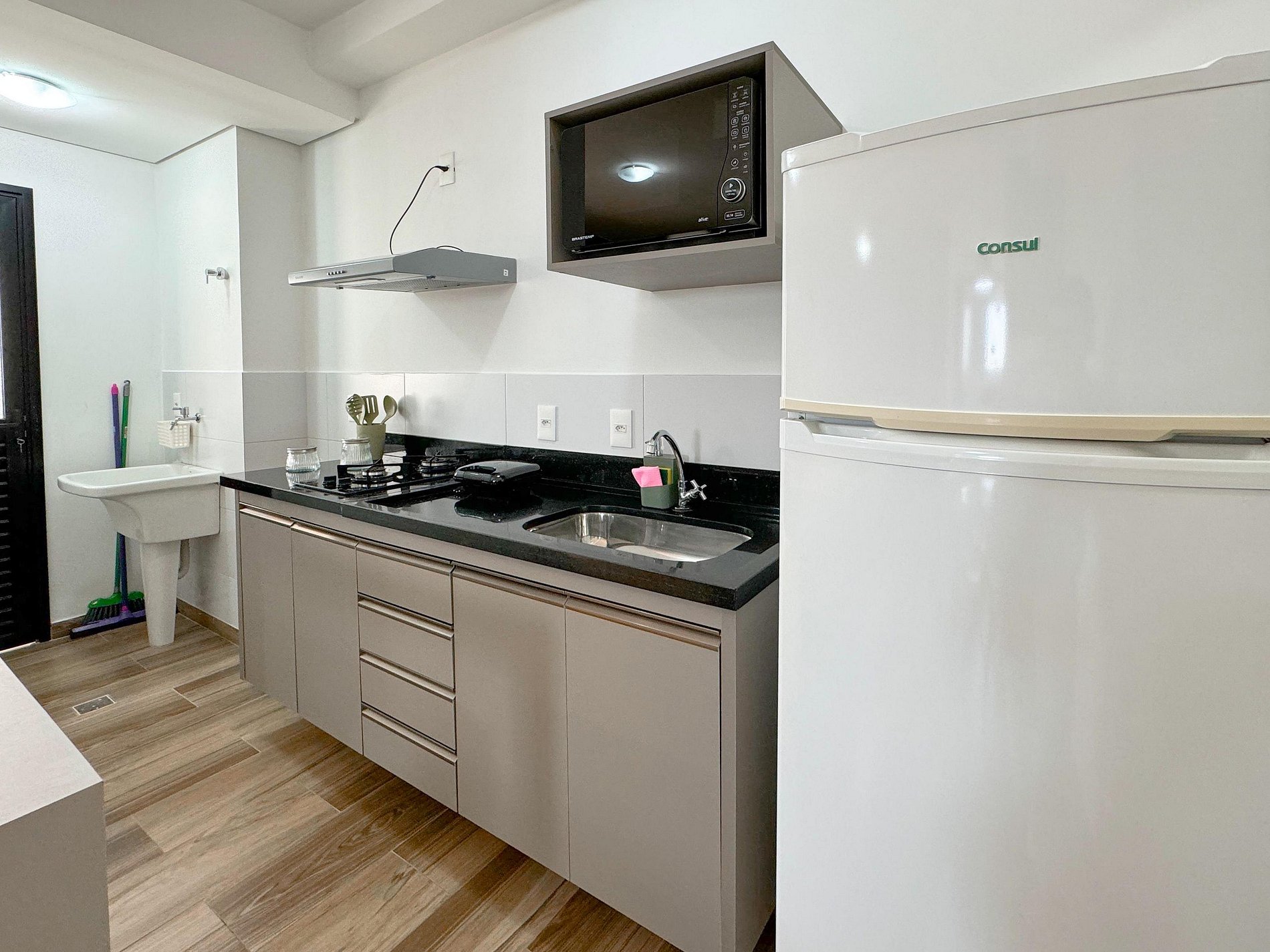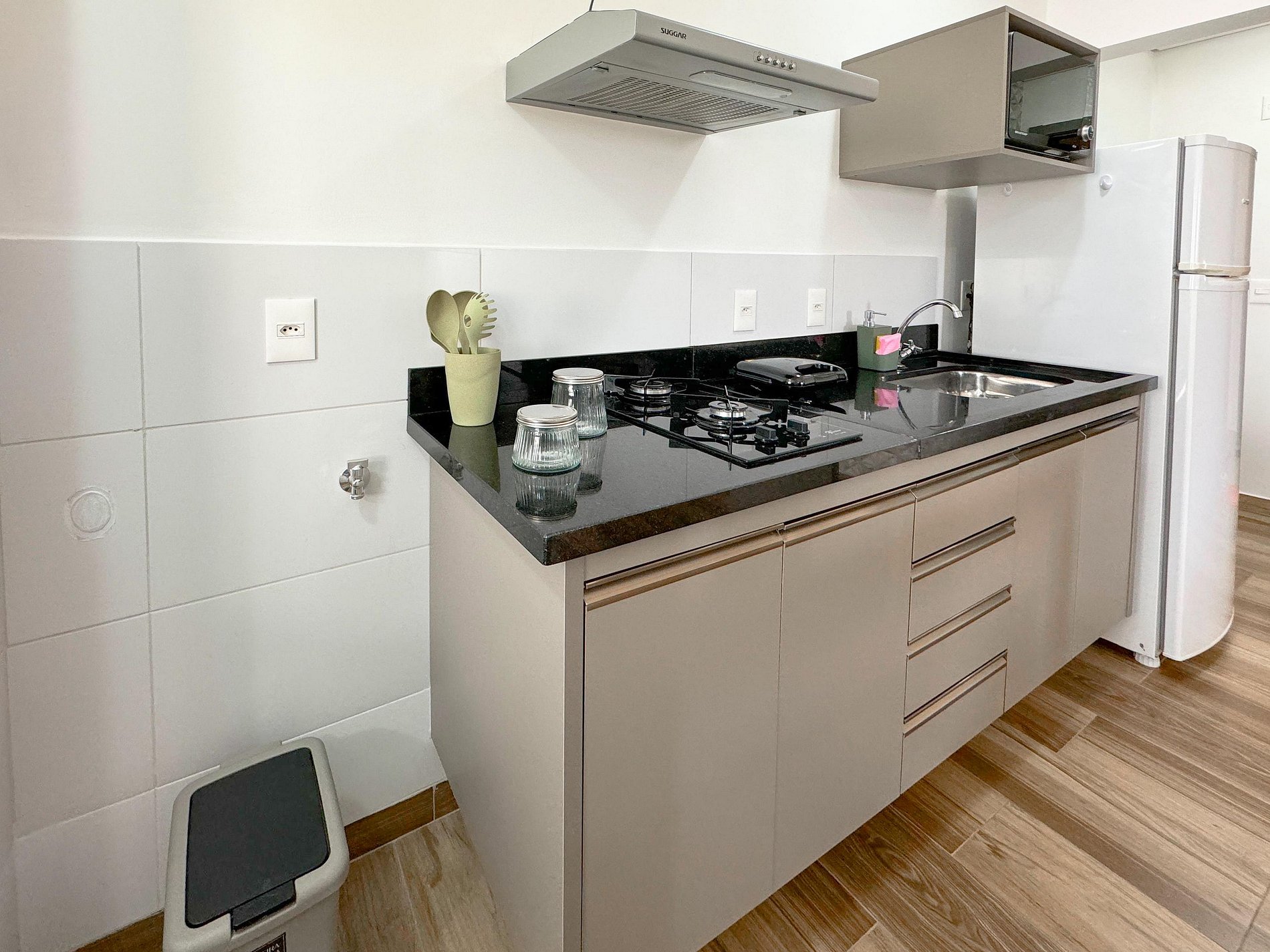 Cozinha com fogão cooktop 2 bocas, geladeira 2 portas, microondas, cafeteira elétrica e sanduicheira. Além de pratos, talheres, copos, taças, panelas e tudo o que precisa para cozinhar do seu jeito.