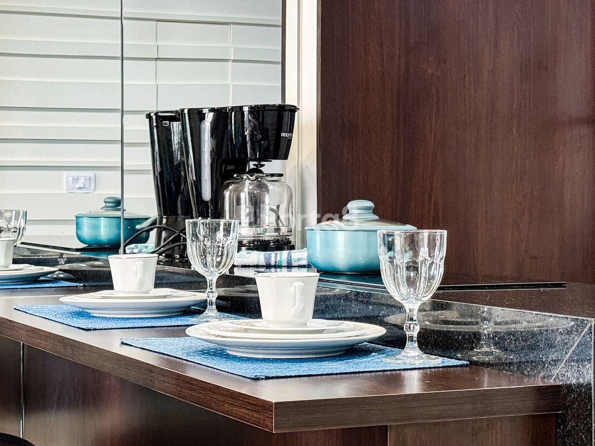 A cozinha compacta possui geladeira frost-free com duas portas bem espaçosa. Tem uma cafeteria elétrica para o preparo do café a seu gosto a hora que sentir vontade. Tem pratos, talheres, copos, taças, facas, tábua, jarra e potes de plástico. Na cozinha ainda tem uma sanduicheira e fogão elétrico de 2 bocas juntamente com as panelas para você preparar uma refeição a seu gosto. Um espaço de refeição com cadeiras confortáveis está a sua espera!