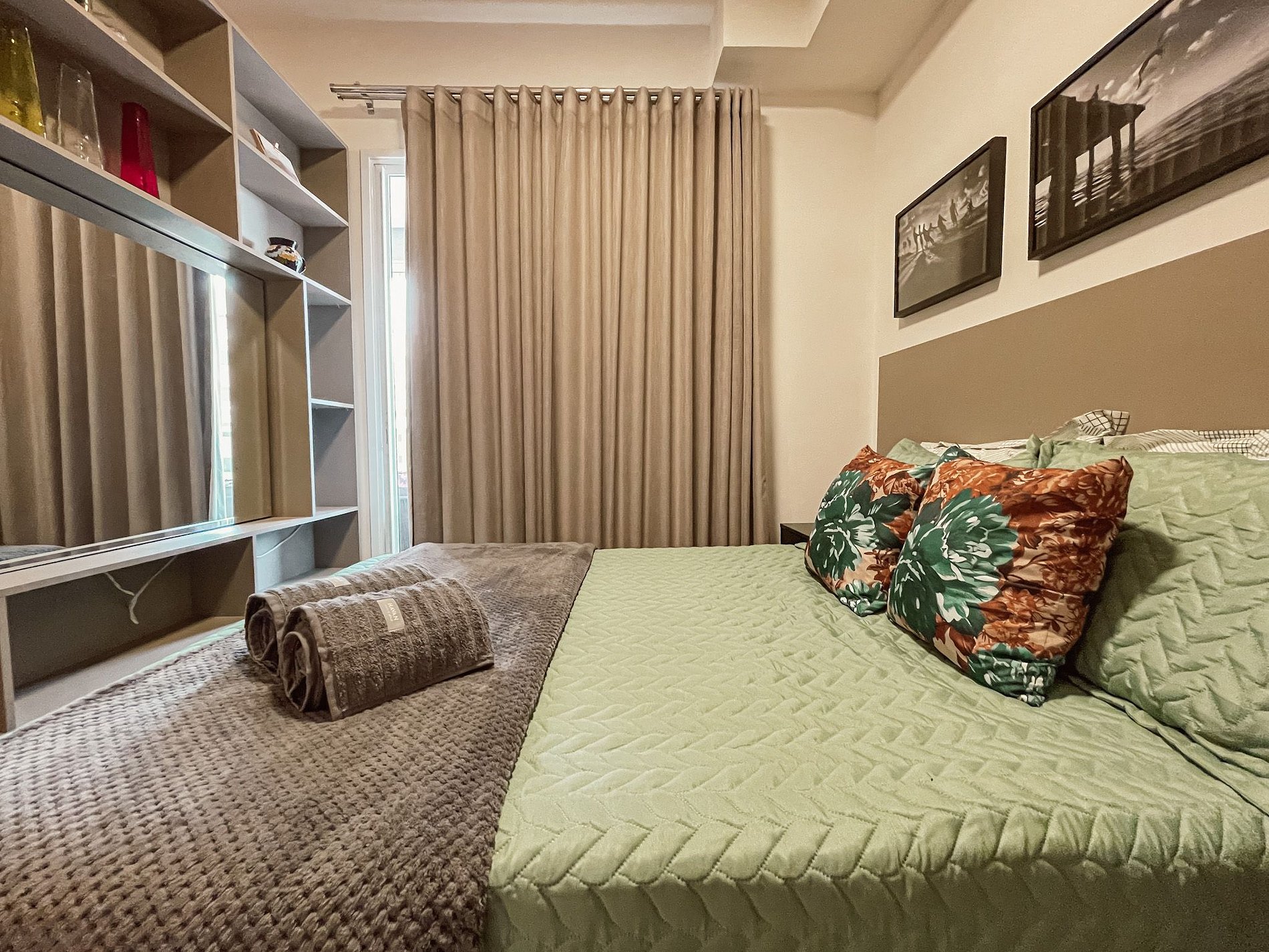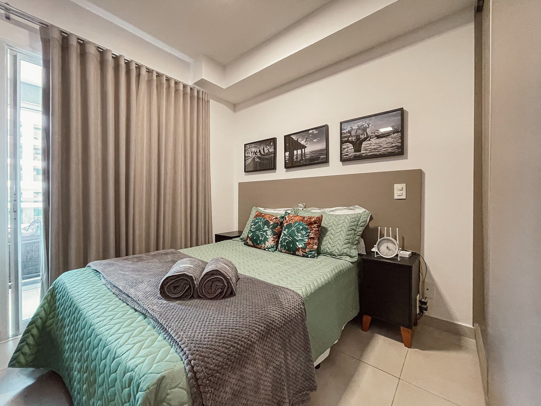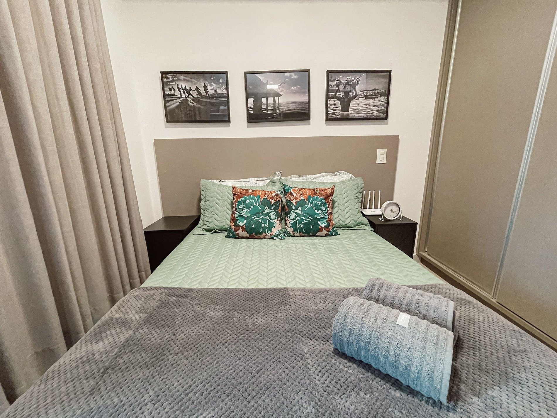 Quarto com cama de casal padrão confortável, travesseiros, manta, e enxoval de cama completos a sua disposição.
