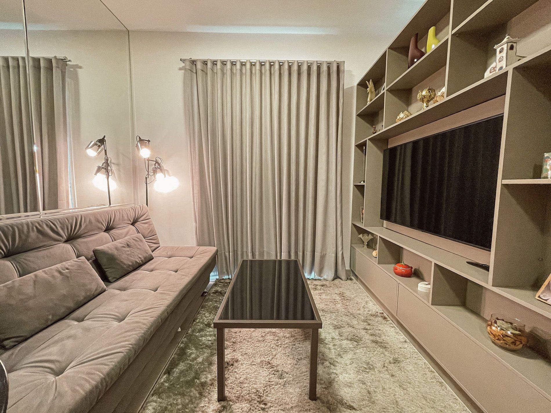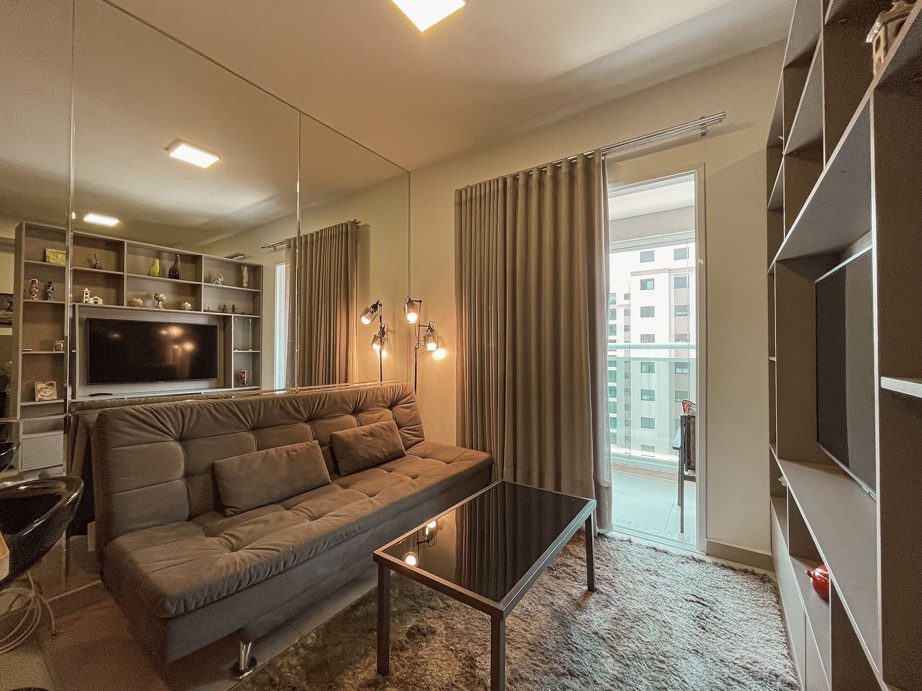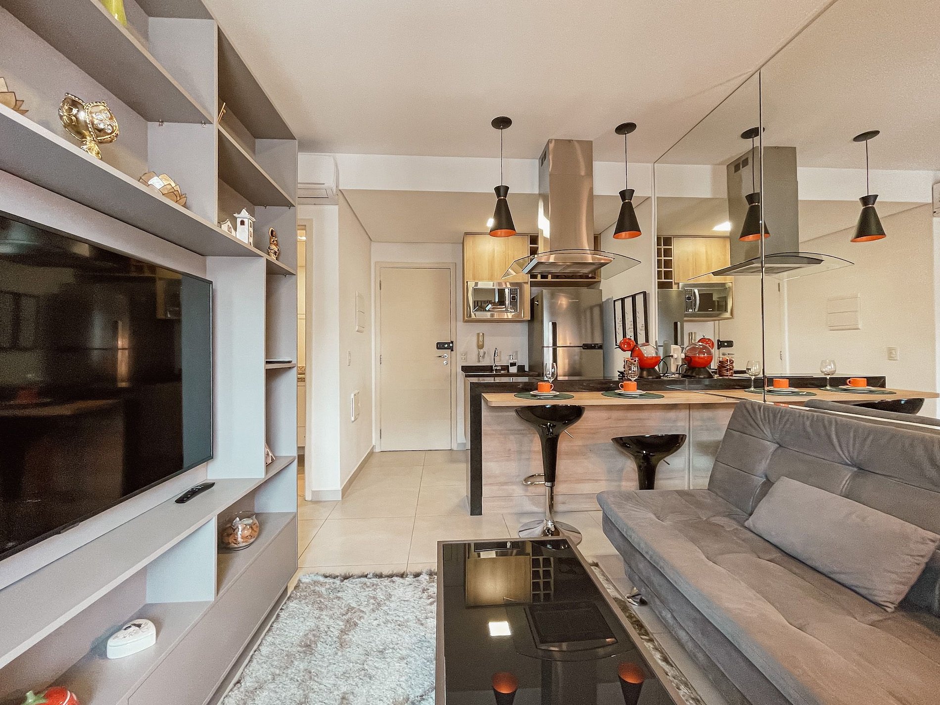 Sala com sofá-cama espaçoso e confortável, iluminação aconchegante, smart TV com os principais app e internet de 300MG para assitir filmes, ouvir músicas tranquilamente.