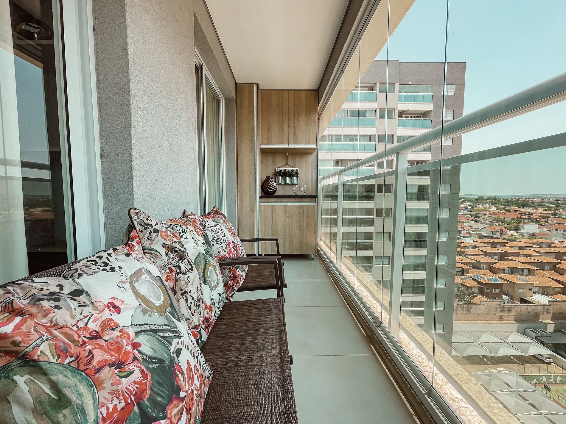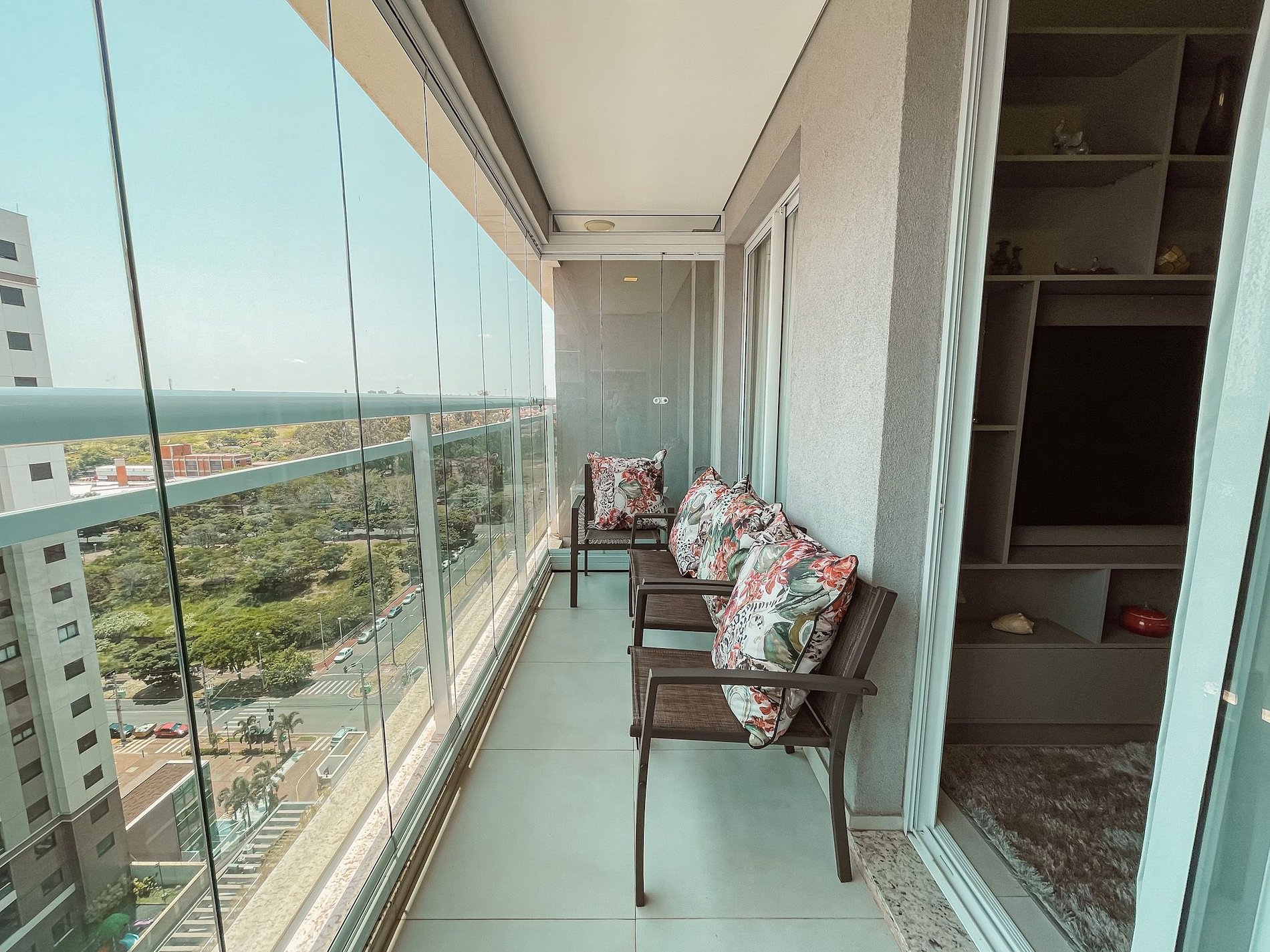 Ahhh varanda é destaque, uma vista para a cidade, de andar alto, com banco para descanso. Você irá adorar passar um tempo ali apreciando a vista com uma bela taça de vinho!