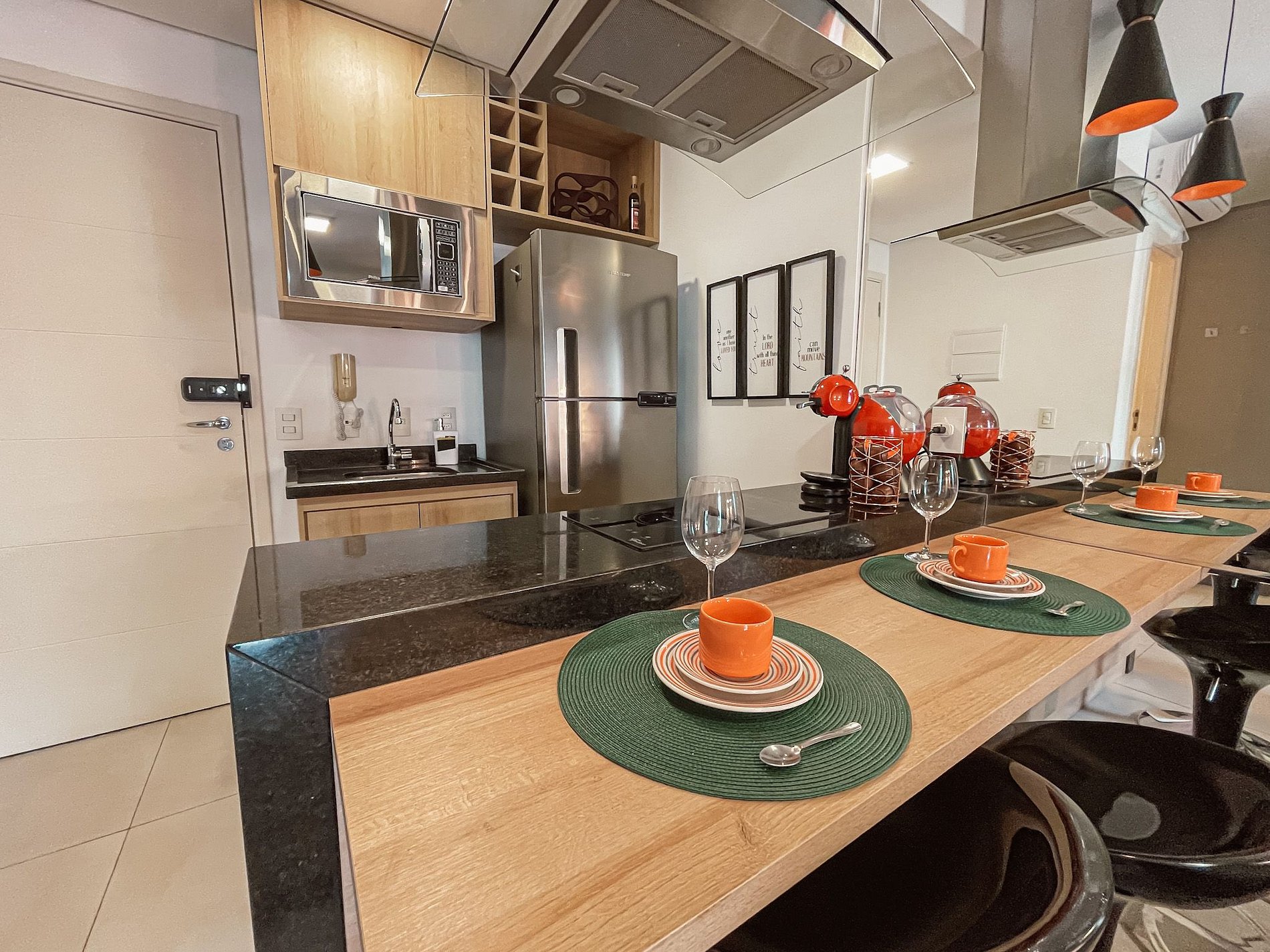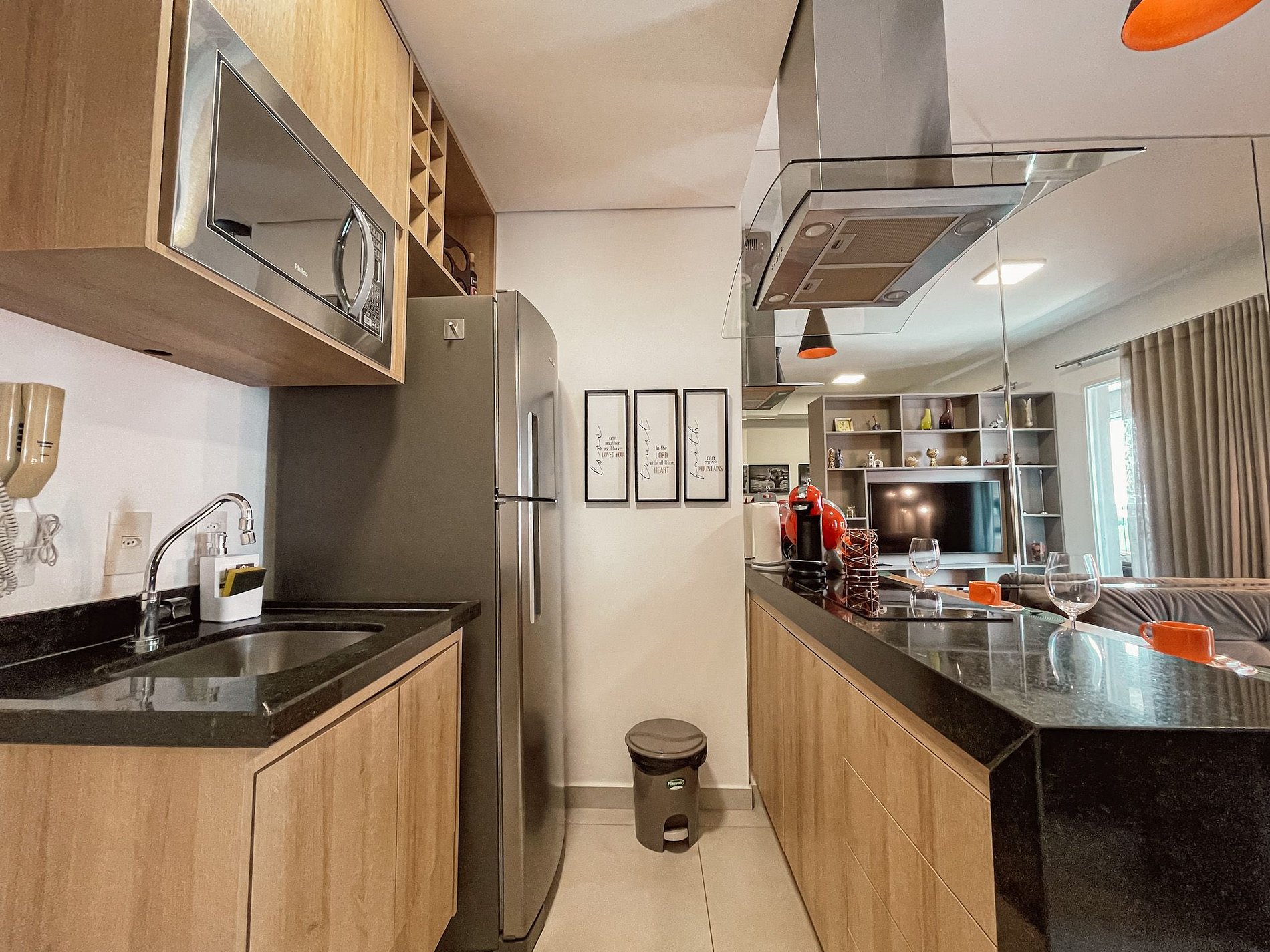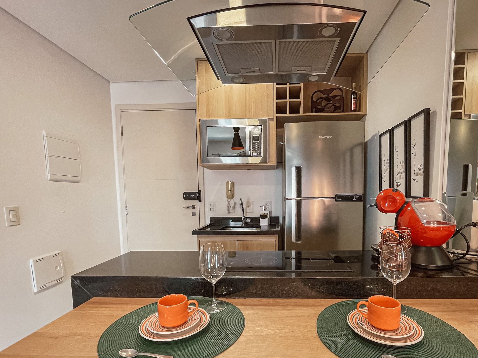 Cozinha equipada com microondas inox, geladeira duplex inox, fogão cooktop 2 bocas e coifa, pratos, xícaras, copos, taças, facas utensílios, panelas, tudo completo para você preparar sua própria refeição! Cafeteira Dolce Gusto para apreciar sua bebida predileta.