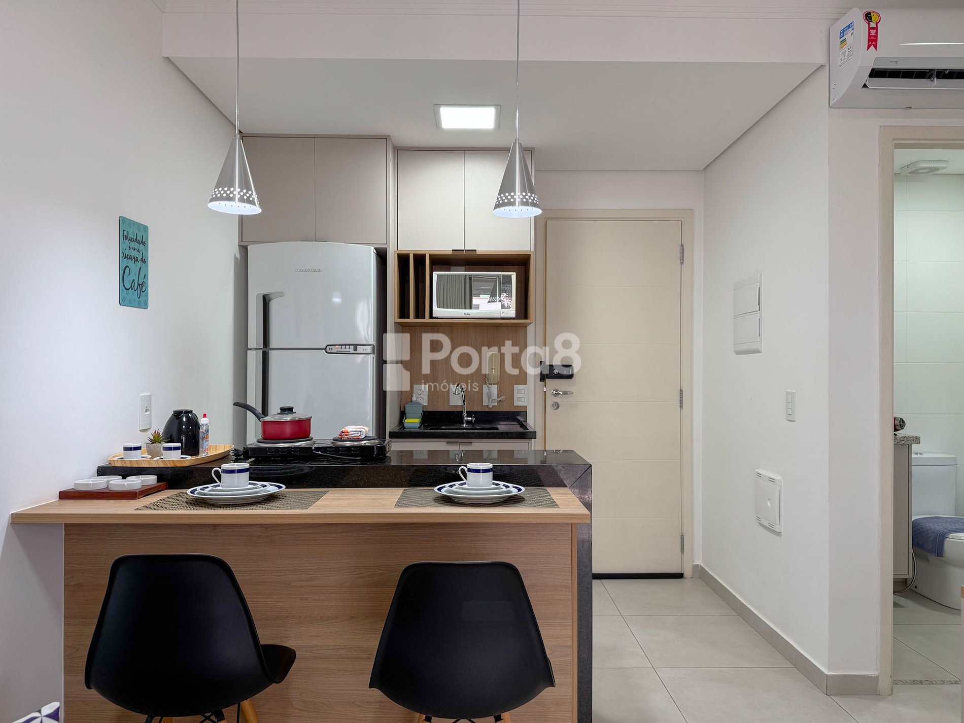 Se bater a fome, a cozinha está equipada com micro-ondas, fogão elétrico 2 bocas e geladeira, além de utensílios para preparar uma refeição completa. E não podemos esquecer da garrafa térmica e do coador de café para um cafezinho fresquinho a qualquer hora.