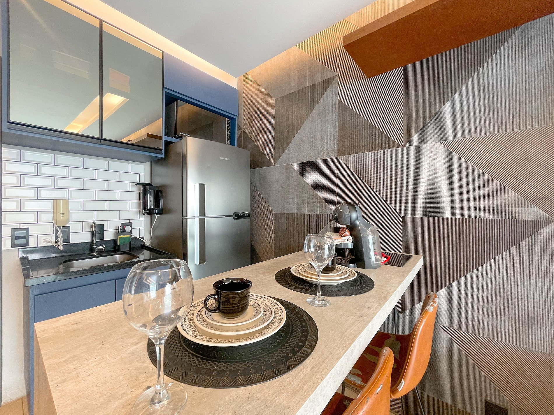 A cozinha compacta é super equipada, com fritadeira airfryer e liquidificador, além de louças e utensílios para fazer suas refeições especiais. E com o cooktop de 2 bocas, você pode cozinhar como um chef!