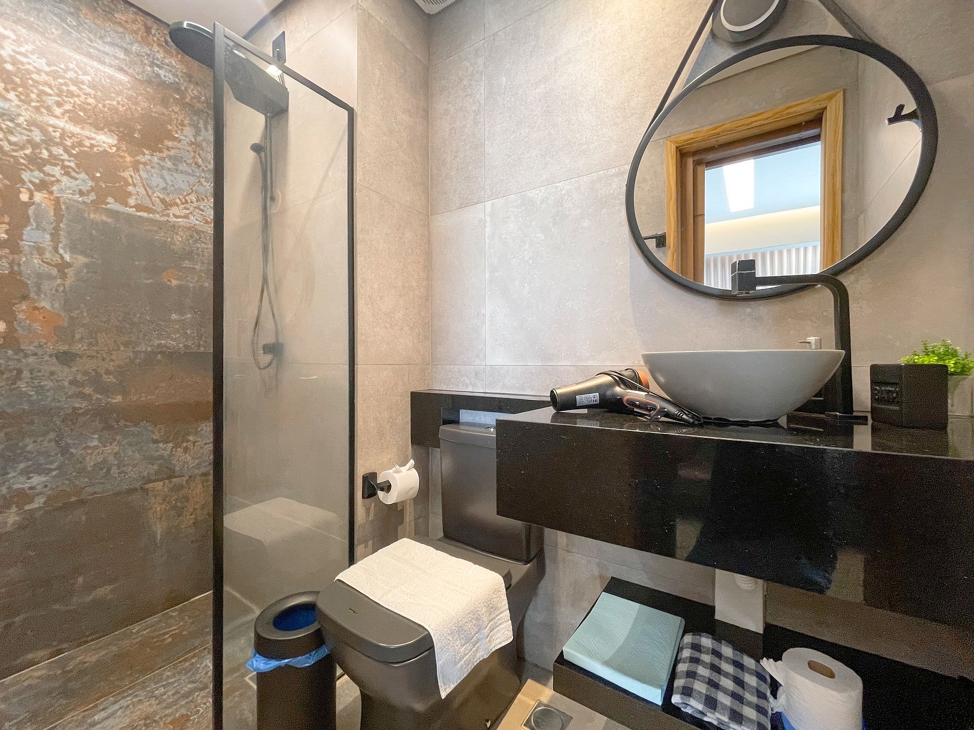 E para finalizar, o banheiro tem um box de vidro e um chuveiro com ducha revigorante. Não tem como não se apaixonar!