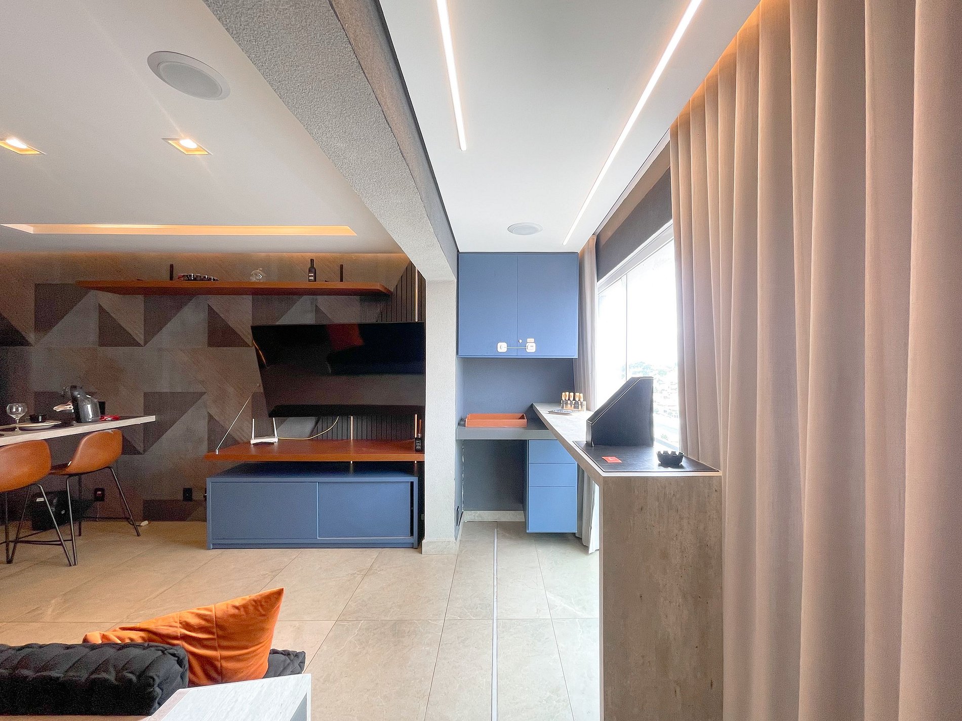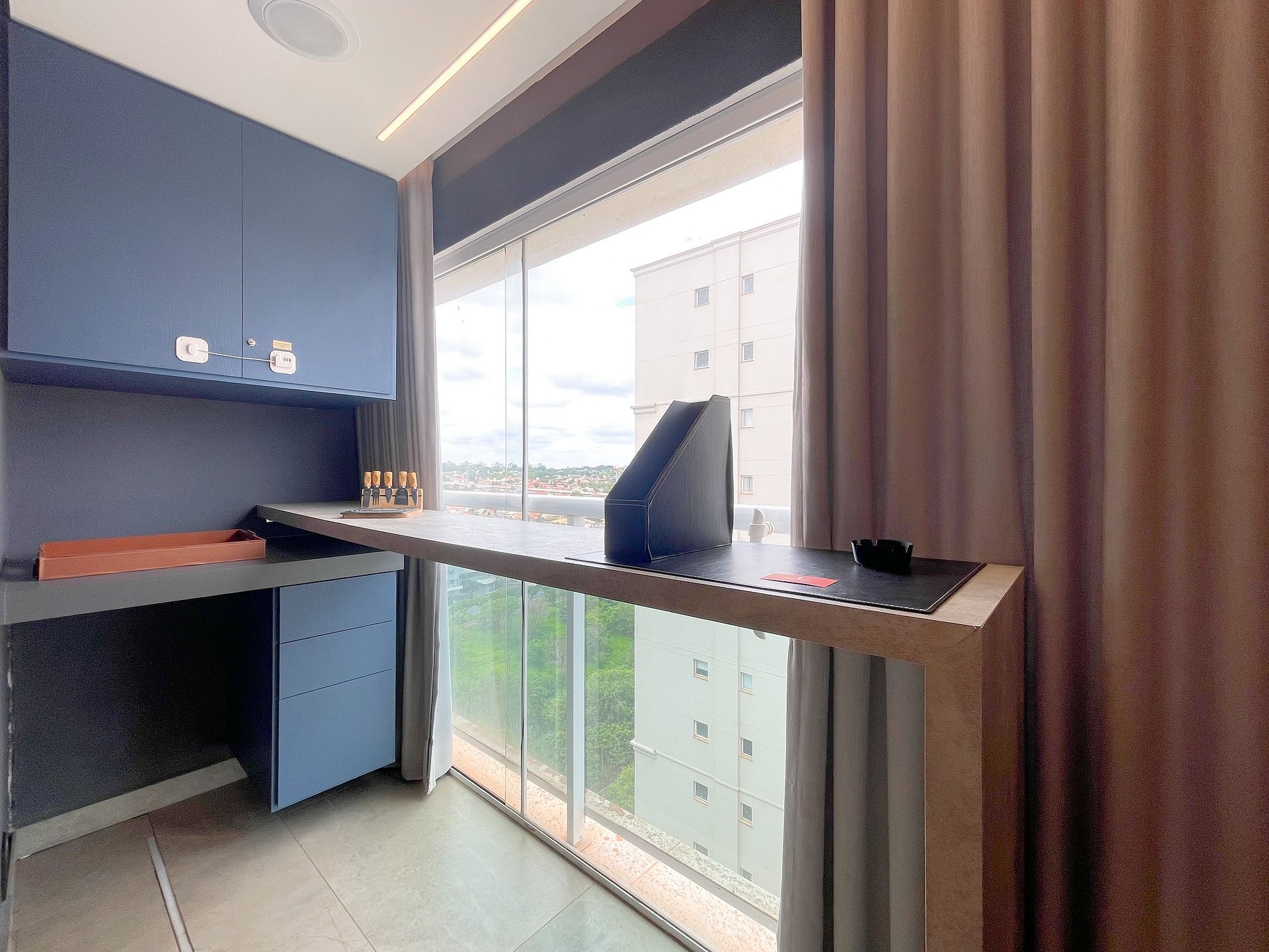 A área de trabalho tem uma vista que é de tirar o fôlego, e a sacada fechada em vidro com cortina blackout torna tudo ainda mais aconchegante.