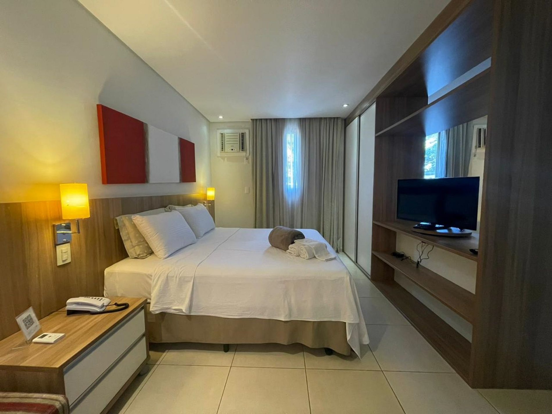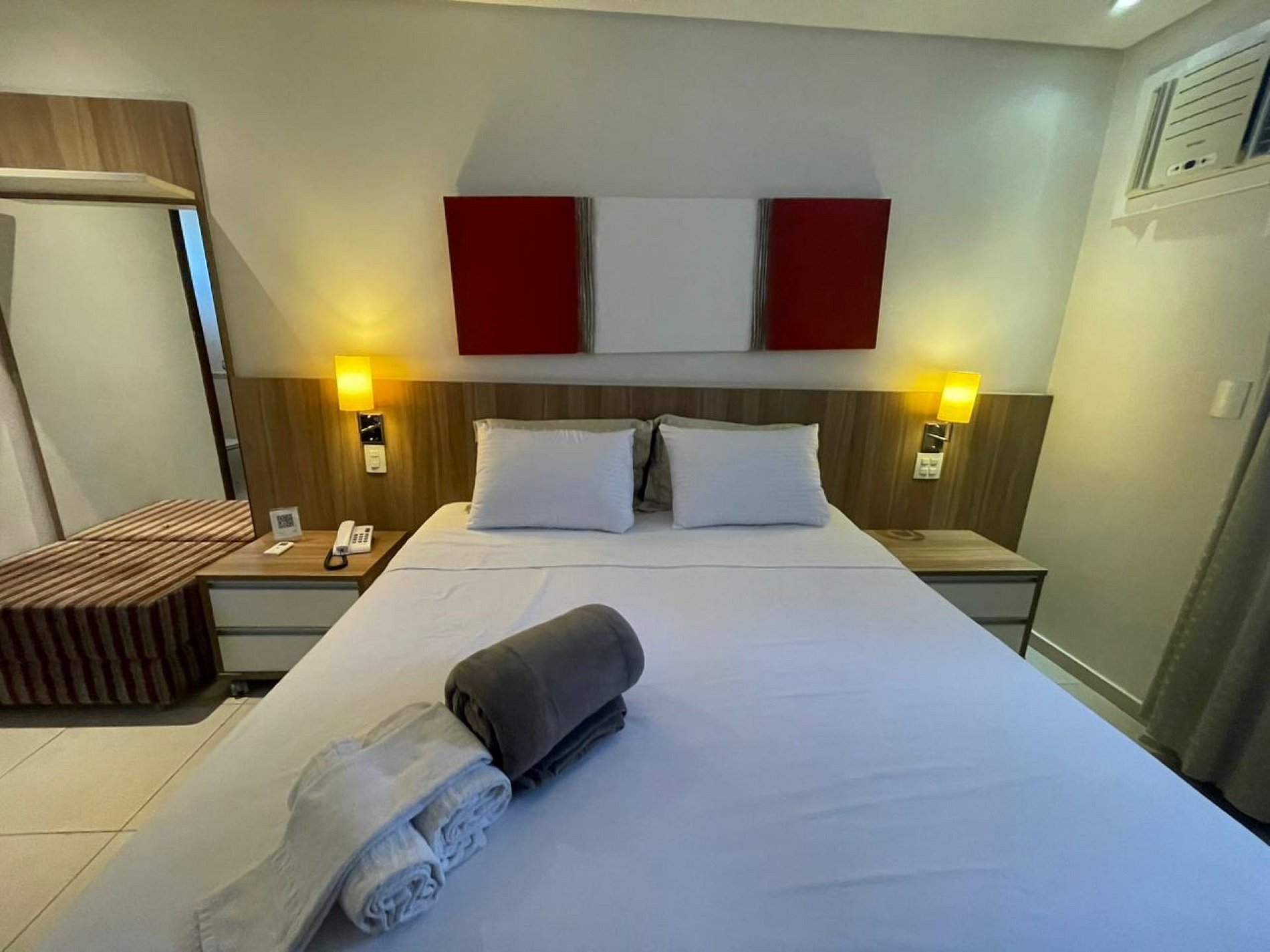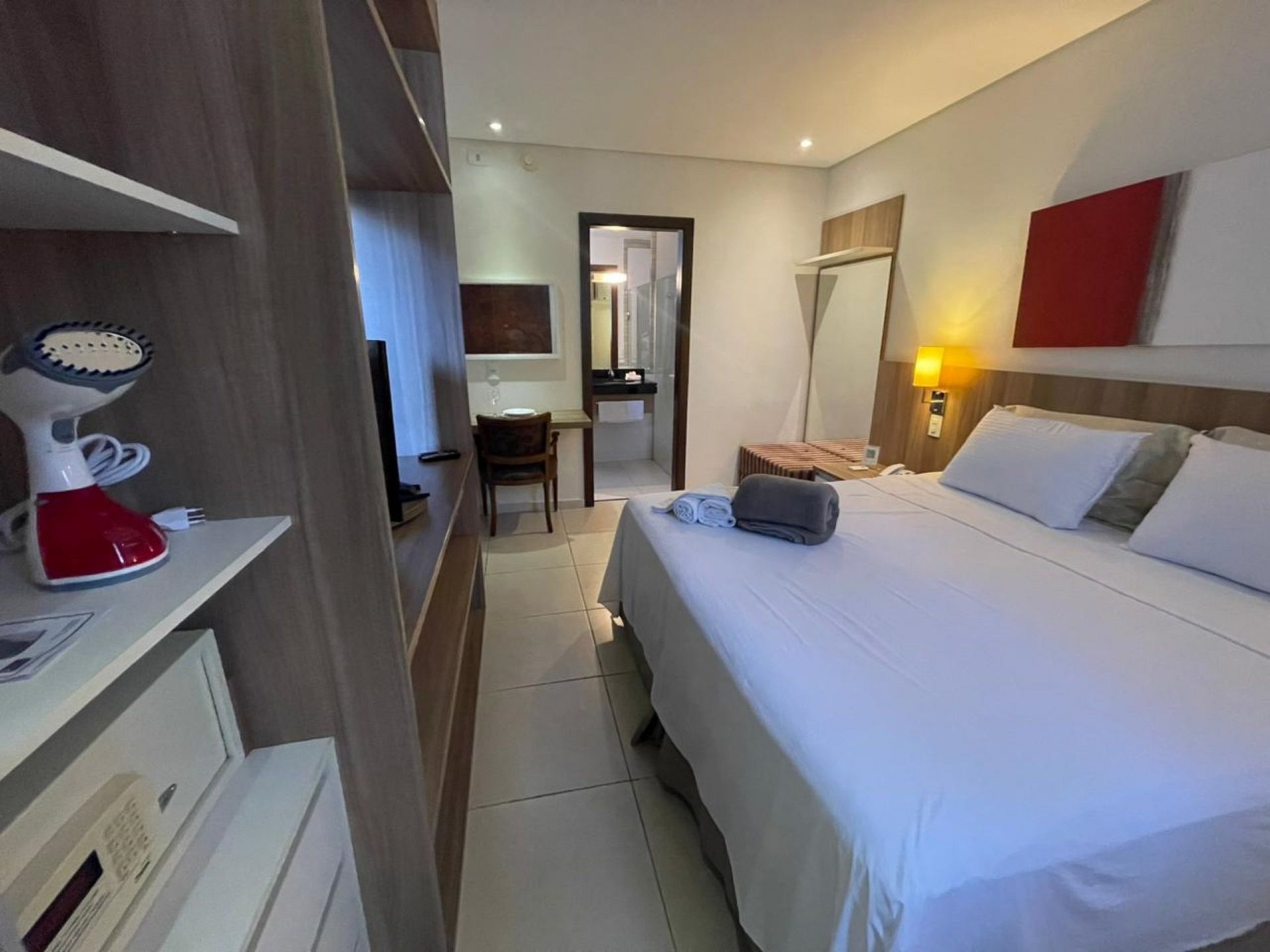 Além dos itens básicos que você já está acostumado a encontrar em um quarto de hotel, como cama queen, travesseiros, enxoval de cama e banho, frigobar, microondas, sofa, TV e ar condicionado, nosso diferencial é: