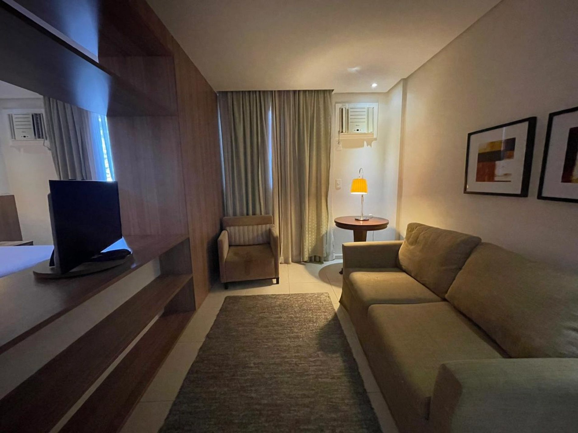 Os apartamentos possuem amplos 36m2 e são equipados com o básico que vocês já está acostumado, cama queen com 4 travesseiros (2 bem confortáveis) e manta, TV tela plana que pode ser utilizada voltada para o quarto ou sala, sofá e poltrona na sala, cortinas blackout, espaço de trabalho amplo com cadeiras e banheiro com ducha quente e toalhas de banho macias e cheirosas.