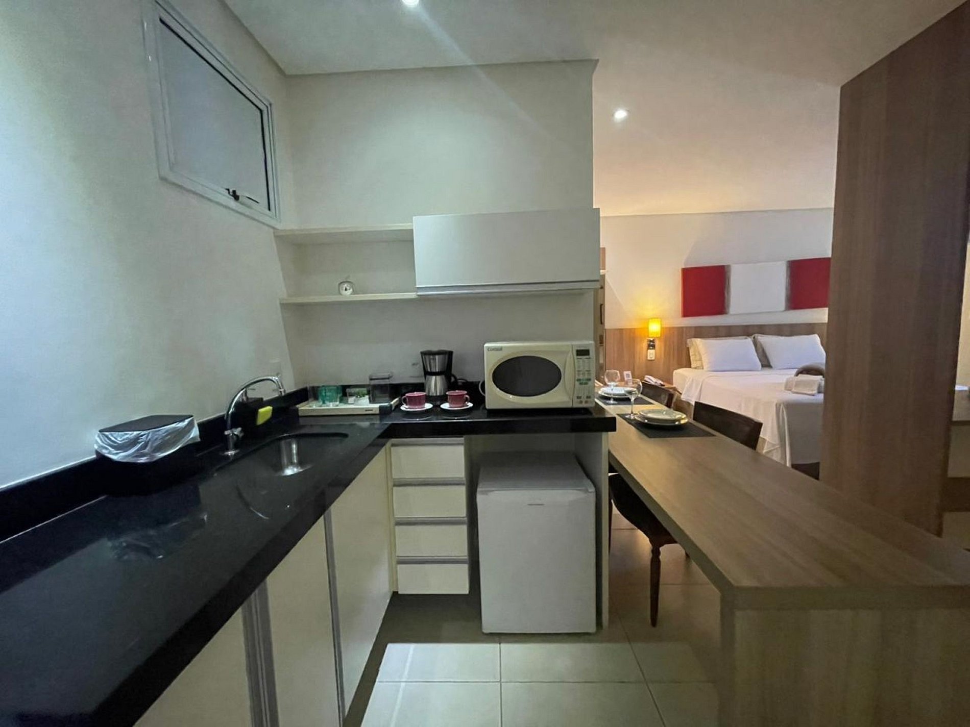E o diferencial está na cozinha, que apesar de ser pequena, oferece tudo o que você precisa para ter uma independência maior na hora de degustar sua refeição.