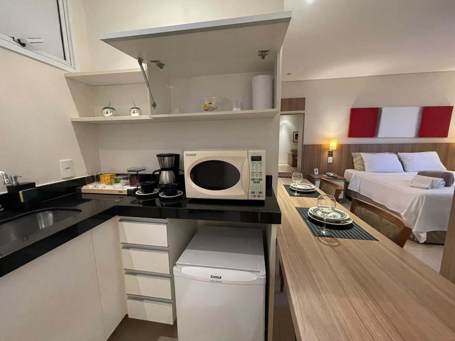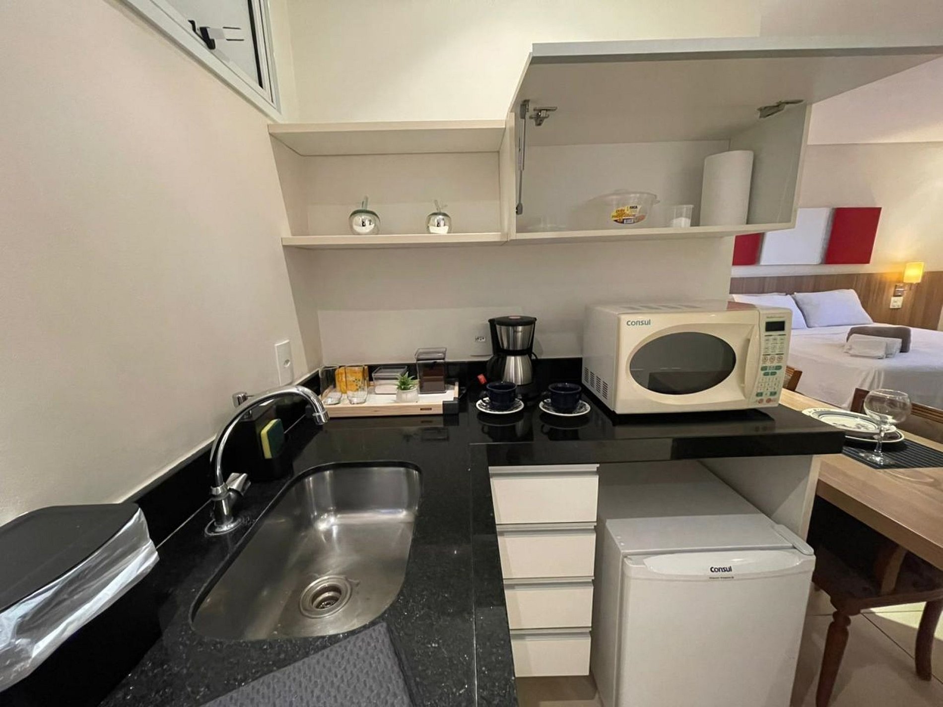 E o diferencial está na cozinha, que apesar de ser pequena, oferece tudo o que você precisa para ter uma independência maior na hora de degustar sua refeição.