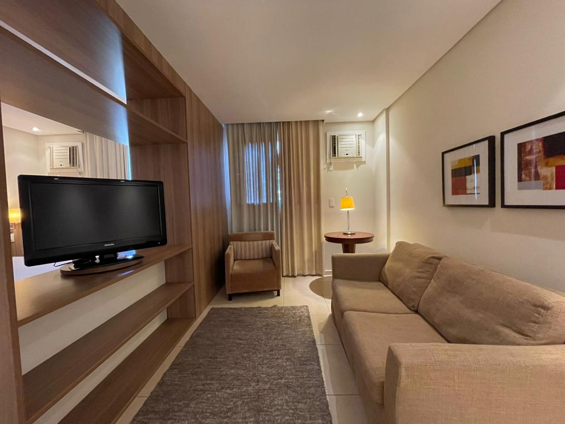 Os apartamentos possuem amplos 36m2 e são equipados com o básico que vocês já está acostumado, cama queen com 4 travesseiros (2 bem confortáveis) e manta, TV tela plana que pode ser utilizada voltada para o quarto ou sala, sofá e poltrona na sala, cortinas blackout, espaço de trabalho amplo com cadeiras e banheiro com ducha quente e toalhas de banho macias e cheirosas.