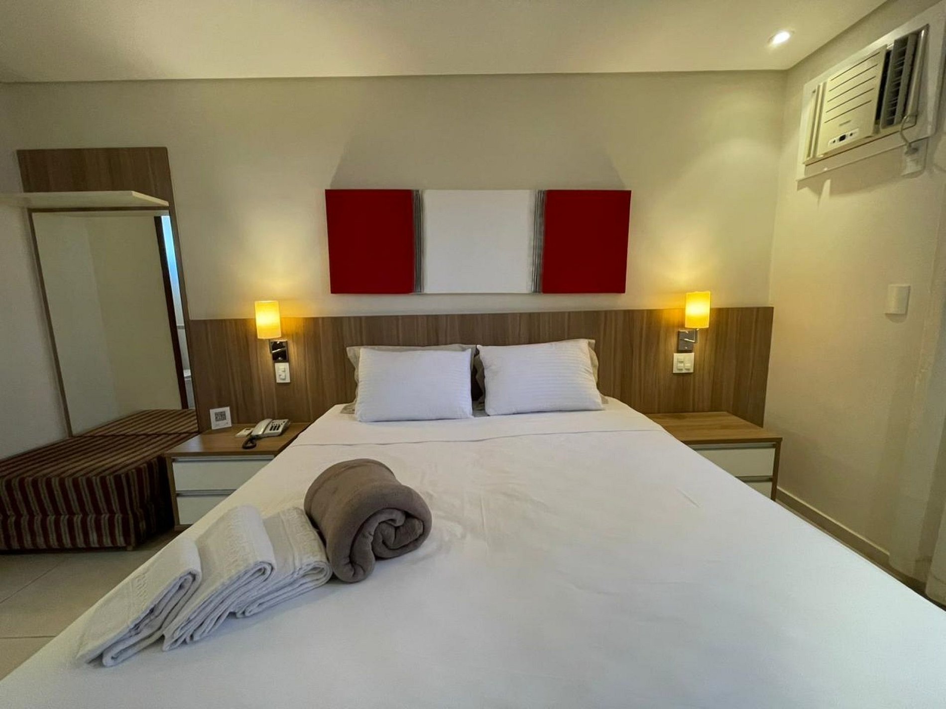 Além dos itens básicos que você já está acostumado a encontrar em um quarto de hotel, como cama queen, travesseiros, enxoval de cama e banho, frigobar, microondas, sofa, TV e ar condicionado, nosso diferencial é: